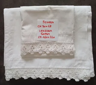 Set vintage composto da un lenzuolo sopra e una federa. La federa ha delle macchie gialle dovute al tempo - Lenzuolo sopra: 160x260 cm - Federa: 90x48 cm - Dettagli in pizzo all'uncinetto