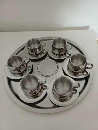 Elegante set di 6 tazzine termiche con i relativi sottobicchieri e un vassoio coordinato. - Acciaio 18/10 - Tazzine dal design moderno - Sottobicchieri inclusi - Vassoio rotondo in metallo - Mai utilizzate