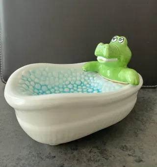 Portasapone in ceramica a forma di vasca da bagno con un simpatico coccodrillo. - Design divertente e originale. - Dettagli colorati. - Ideale per il bagno.Nella foto c'è la misura