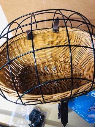 Cestino in vimini con struttura esterna in metallo, ideale per il trasporto di animali. - Materiale: vimini e metallo. - Cinghie in pelle per il fissaggio. Particolari e misure in foto.