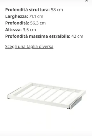 Porta pantaloni estraibile per armadio IKEA Pax. Ideale per organizzare i tuoi pantaloni. - Profondità struttura: 58 cm - Larghezza: 71.1 cm - Profondità: 56.3 cm - Altezza: 3.5 cm - Profondità massima estraibile: 42 cm