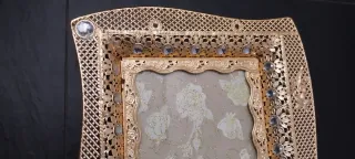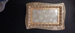 Elegante vassoio decorativo con finiture dorate e inserti trasparenti. - Cornice in metallo lavorato. - Dettagli floreali. - Cristalli incastonati. Nuovo mai usato con ancora I manici da montare La misura è 47x32 cm