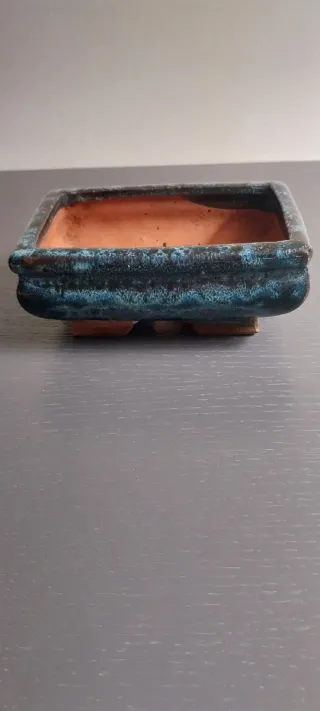 Set di due vasi rettangolari per bonsai. - Realizzati in terracotta con finitura esterna blu e nera. - Presentano fori di drenaggio sul fondo. Misure 14x10 cm