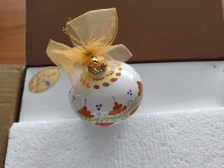 Palline di Natale artigianali in ceramica faentina, decorate a mano. - Decorazioni floreali arancioni e blu. - Finitura bianca lucida. - Ideali come decorazione per l'albero o come bomboniera.
