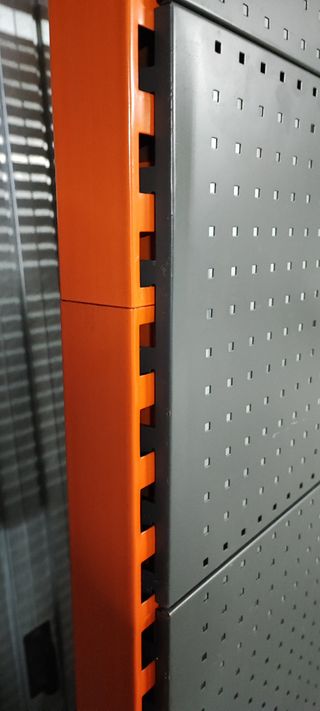Pratica scaffalatura da esposizione, ideale per organizzare e mostrare oggetti. - Struttura robusta in metallo. - Design a griglia con fori quadrati. - Finitura in color grigio/argento. - Facile da trasportare e da montare