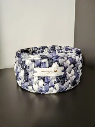Elegante cestino realizzato a mano con fettuccia. - Motivo intrecciato nei toni del blu, grigio e bianco. - Etichetta Hand Made with Love applicata sul davanti. Misure: diam.15 cm , h 7,5 cm