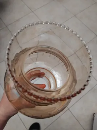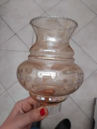 Elegante paralume in vetro con finitura color ambrato e trasparente. Presenta un design decorato con pois. - Bordo superiore con motivo a onda. - Base con attacco trasparente. -In ultima foto si nota un piccolo difetto nel vetro che non è una spaccatura...