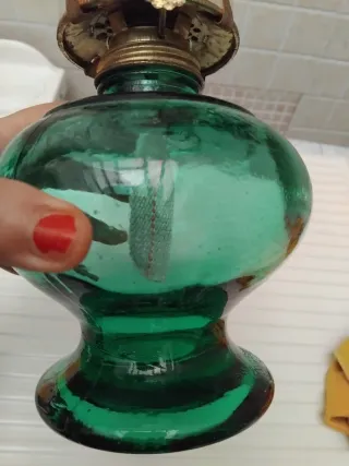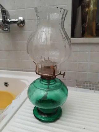Lampada a olio dal design classico, perfetta per aggiungere un tocco vintage alla tua casa. - Base e serbatoio in vetro verde. - Cappello in vetro trasparente. - Dettagli in metallo. -Presenta un po' di ruggine sul metallo.