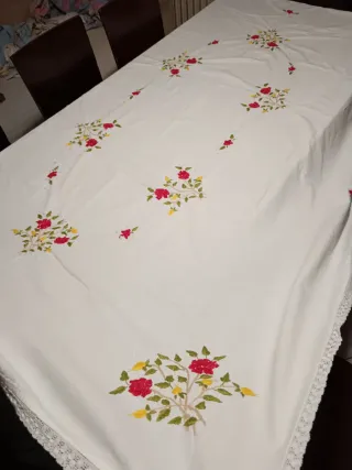 Elegante tovaglia in cotone, perfetta per dare un tocco di classe alla tua tavola. - Ricami floreali rossi e gialli. - Bordi in pizzo bianco. - Realizzata in cotone