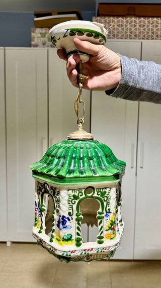 Splendido lampadario in ceramica con un design ispirato a un gazebo. - Tetto verde con texture di tegole. - Corpo bianco con archi e dettagli floreali dipinti a mano. - Sospeso con catena metallica.