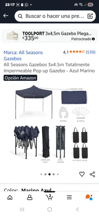 Gazebo pieghevole del marchio All Seasons, ideale per esterni. Facile da montare e trasportare. Struttura in metallo, colore blu marino. Include telone, borsa per il trasporto con ruote, picchetti e corde per il fissaggio, e 4 sacchi di sabbia per il peso.