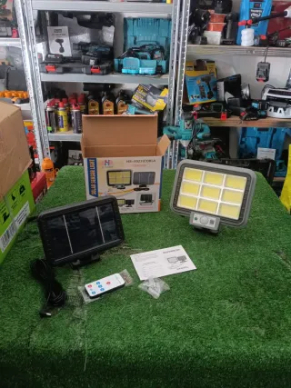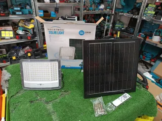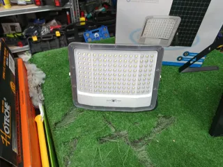Set completo per illuminazione solare con faretto ad alta potenza e pannello dedicato. - Faretto LED da 400W. - Pannello solare incluso. - Telecomando per il controllo. - Kit di montaggio con viti.