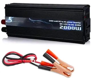 Inverter di potenza 2000W per convertire la corrente da 12V DC a 220V AC. Ideale per alimentare dispositivi elettronici. - Potenza continua: 1000w - Potenza massima: 2000W - Tensione di ingresso: 12V DC - Tensione di uscita: 220V AC - Include cavi con morsetti a coccodrillo per il collegamento alla batteria.