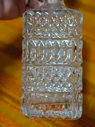 Raffinata bottiglia antica in cristallo, completa di tappo. Un pezzo decorativo con un design intricato. - Realizzata in cristallo trasparente. - Tappo coordinato incluso.