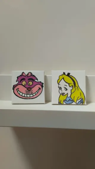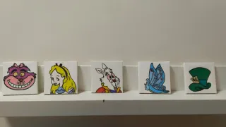 Set di piccole tele dipinte a mano con personaggi iconici. Misura 7×7 - Ogni tela è montata su un cavalletto in legno. - I disegni includono il Cappellaio Matto, il Gatto del Cheshire, il Bianconiglio, Alice e il Brucaliffo