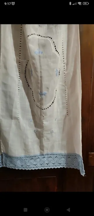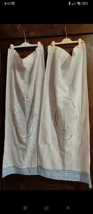 Deliziose tende in tessuto con un elegante bordo azzurro all'uncinetto. Panetti da mettere vicino alle portiere oppure utilizzarle come tende. Lunghezza 1.22 cm, larghezza 1.58 cm, Vedi bene le foto perché presentano delle imperfezioni - Motivo traforato decorativo. - Bordo in pizzo azzurro.