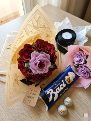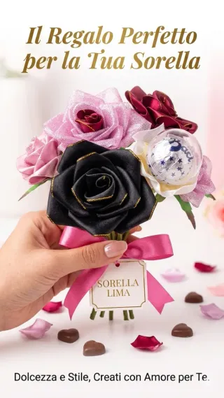 Bellissimo bouquet di rose in raso, perfetto per un regalo speciale. - Fatto a mano con cura. - Dettagli in glitter per un tocco di eleganza. - Un delizioso cioccolatino.