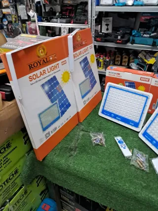 Lampada solare ROYAL da 800W, ideale per illuminare esterni. La confezione include il telecomando per un facile controllo. - Potenza: 800W - Alimentazione: Solare - Controllo: Telecomando incluso - Grado di protezione: IP66