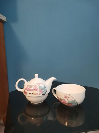 Servizio da tè per una persona in porcellana decorata, in 3 pezzi impilabili: teiera, coperchio, tazza