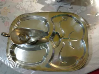 Elegante vassoio con salsiera, perfetto per servire. Con salsiera e piccolo mestolo. - Finitura silver plated. - Design curato con scomparti.