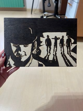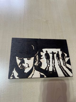 Quadro decorativo realizzato a mano, ispirato al film Arancia Meccanica. Un pezzo unico per gli amanti del cinema. - Tecnica di pirografia su legno. - Design dettagliato e d'impatto.