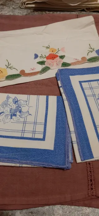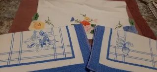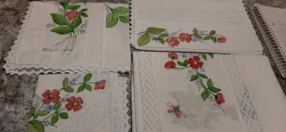 Set di portaposate e 4 tovagliette decorate con fiori dipinti a mano. Un tocco artistico per la tua tavola. - Decorazione floreale con dettagli in pizzo fatto a uncinetto. - Pezzi unici realizzati a mano. Portaposate 25x18 cm. 1 tovaglietta 25x25 cm. 1 tovaglietta 36x40 cm. 1 tovaglietta 52x38 cm. 1 tovaglia 72x72 cm.