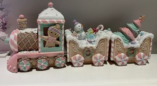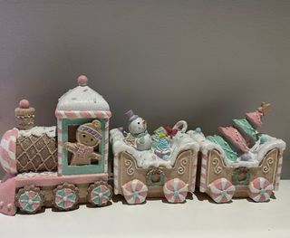Un adorabile trenino decorativo a tema natalizio, perfetto per aggiungere un tocco di festa alla tua casa. - Design a tema biscotti di pan di zenzero. - Dettagli scintillanti e colorati. - Include personaggi come un pupazzo di neve e un omino di pan di zenzero.