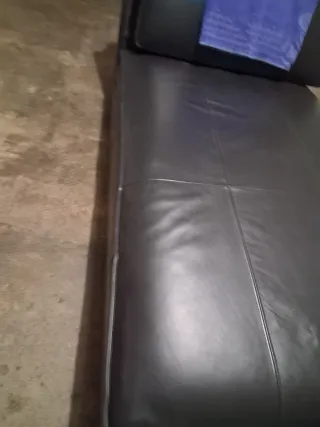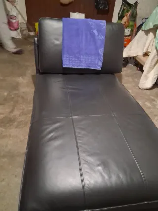 Elegante divano in pelle, perfetto per aggiungere un tocco di stile alla tua casa. Il cuscino viola dona un contrasto vivace. - Rivestimento in pelle di alta qualità. - Design moderno e confortevole.