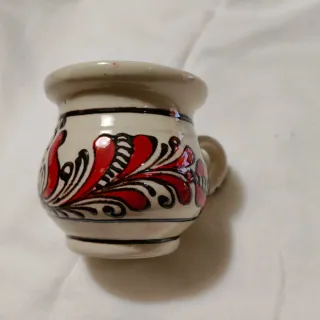 Piccola caraffa in ceramica con un design floreale dipinto a mano. Perfetta come elemento decorativo. - Decorazioni rosse e nere. - Manico pratico.