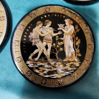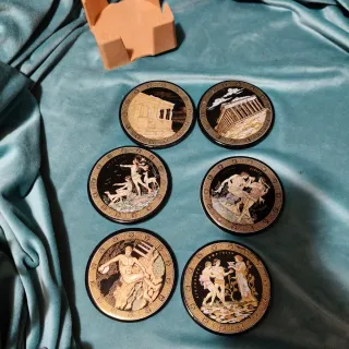 Elegante set di sottobicchieri con decorazioni ispirate all'arte greca antica. Perfetti per aggiungere un tocco di classe alla tua tavola. - Sei sottobicchieri inclusi. - Raffigurazioni di scene mitologiche e architetture classiche. - Bordi dorati rifiniti con cura. Foderato sotto