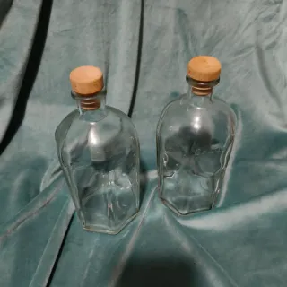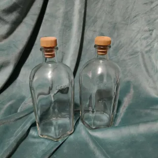 Set di due bottiglie da 0.5 l in vetro trasparente, perfette per conservare liquidi o come elementi decorativi. Ogni bottiglia è dotata di un tappo in sughero per una chiusura sicura. - Materiale: Vetro e sughero. - Colore: Trasparente.