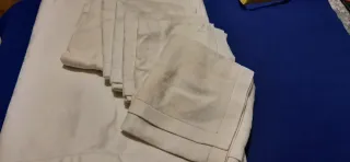 Elegante tovaglia in fiandra di lino, completa per sei persone. - Tessuto pregiato con lavorazione jacquard, inoltre tovaglia e tovaglioli rifiniti tutti con orlo a giorno fatto a mano. - Ideale per occasioni speciali o per arricchire la tavola quotidiana. Misura 144x127 cm. Tovagliolo 45x45 cm.