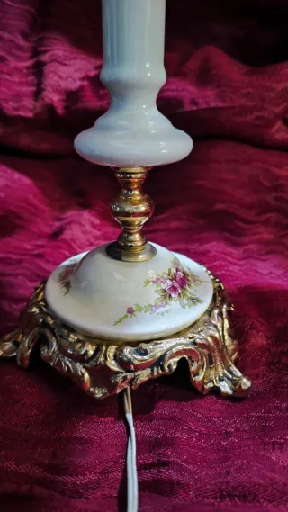 Set composto da un lampadario e una coppia di lampade da comodino, risalenti agli anni '70. L'elemento centrale del lampadario presenta una base in metallo dorato finemente lavorato e un corpo in porcellana bianca. Le lampade da comodino, anch'esse con base in metallo dorato e dettagli in porcellana, sono decorate con un delicato motivo floreale. - Base in metallo dorato con decorazioni. - Corpo in porcellana bianca. - Motivo floreale dipinto sulle lampade.