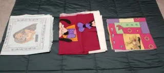 Stoffa in cotone azzurrina misura 160x160cm circa ideale per cuscini 35x35cm con personaggi Pocahontas + stoffa in cotone ancora con stampe a tema Pocahontas misura 68x160cm con colorazioni lilla + stoffa in cotone con personaggi di Topolino misure 134x176cm ideale per cuscini 40x40cm.
