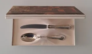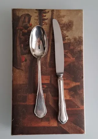 Elegante set composto da un cucchiaino da dessert e un coltello, realizzati in pregiato argento 800 agli inizi anni '70 - Materiale: Argento 800; - Lama del coltello in acciaio inox, manico argento; - Finitura: lucida; - Design classico ed elegante
