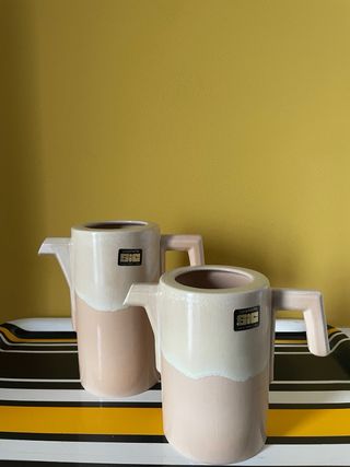Set Brocche in Ceramica Sic Casale Monferrato Made in Italy vintage anni 80,retrò, decorazione panna e avorio colata a mano Grande cm 10 di diametro cm 18 di altezza Piccola cm 10 di diametro cm 14 di altezza Ottime Condizioni Assicuro spedizione accurata con imballaggio ben protetto Elegante set di brocche in ceramica. - Design moderno e raffinato. - Perfetto per servire bevande con stile.