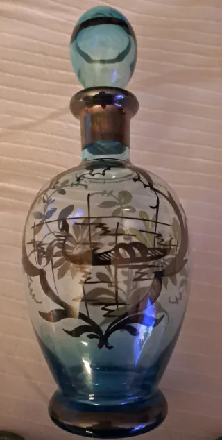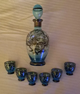 Elegante set da liquore vintage in stile Art Déco, perfetto per servire i tuoi distillati preferiti con un tocco di classe. - Include una bottiglia con tappo e sei bicchierini. - Decorazioni raffinate con motivi floreali e paesaggistici. - Dettagli dorati sul collo della bottiglia e sui bordi dei bicchierini.