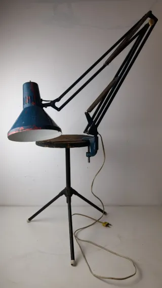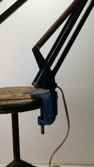 Lampada da lavoro vintage, perfetta per un ambiente industriale o da officina. La sua struttura in metallo e plastica la rende robusta e durevole. - Design industriale iconico. - Braccio articolato per posizionamento flessibile. - Base a morsetto per fissaggio sicuro.