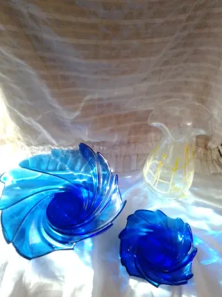 Set di due ciotole decorative in vetro blu e un vaso trasparente. - Ciotole con design a petalo. - Vaso con decorazione a griglia gialla.