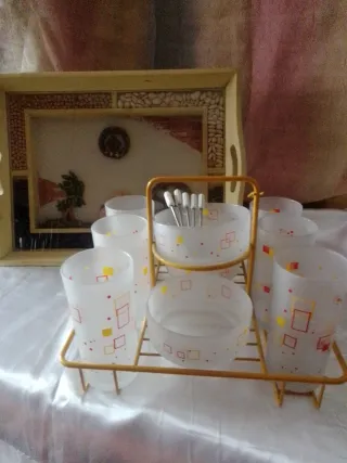 Elegante vassoio con un set di bicchieri e ciotole, perfetto per servire. - Vassoio in legno color giallo. - Sei bicchieri in vetro trasparente con decorazione a quadrati. -Tre ciotole in vetro trasparente con decorazione a quadrati. -