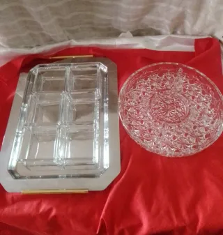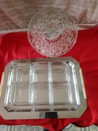 Set composto da un vassoio in acciaio inox con divisori e un piatto rotondo in vetro. - Vassoio con 6 scomparti. - Piatto in vetro decorato.