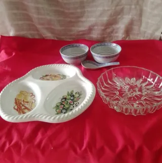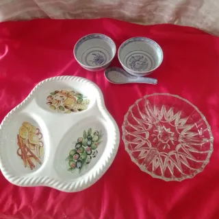 Elegante set per servire antipasti, composto da diversi pezzi. - Piatto in ceramica con tre scomparti decorato con frutta e olive. - Ciotoline in ceramica con decoro blu. - Cucchiaino in ceramica. - Piatto in vetro trasparente con divisori.