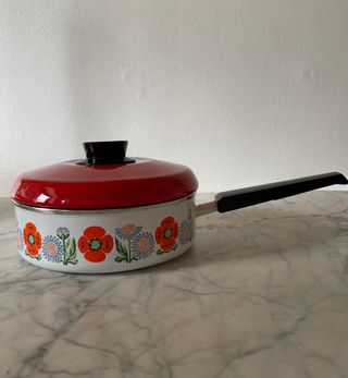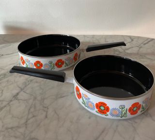 Set Pentola Tegami in Acciaio Smaltato Bianco con decorazione Floreale con coperchio rosso Misure Tegame cm 20 di diametro cm 6.5 di altezza Tegame cm 24 di diametro cm 6.5 di altezza Condizioni Non Usate Pari al Nuovo con Etichette Originali e Garanzia Euroflora Nahratt Set di pentole e tegami in acciaio smaltato bianco con un vivace motivo floreale. - Coperchio rosso con pomello nero. - Manico nero in plastica. - Decorazione con fiori rossi e blu e foglie verdi.