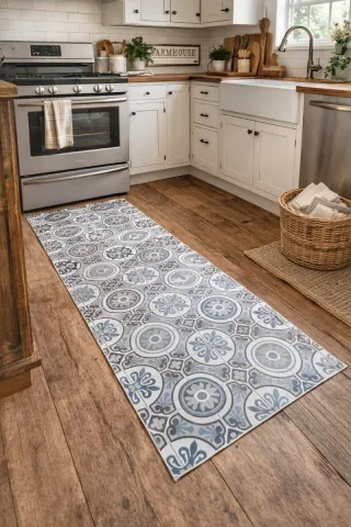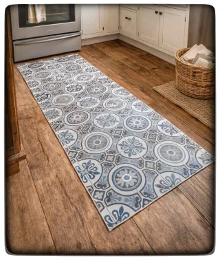 Bellissimo tappeto passatoia con un design che ricorda le classiche piastrelle di maiolica. Ideale in cucina come sotto lavello e zona cottura ma perfetto in qualunque altro ambiente MISURA 150x50 cm NUOVO MAI UTILIZZATO - Motivo decorativo stile cementine nei toni grigio azzurro - Materiale resistente e facile da pulire basta una passata di spugna! Non scivola sul pavimento e non si deforma In Vinile di alta qualità