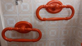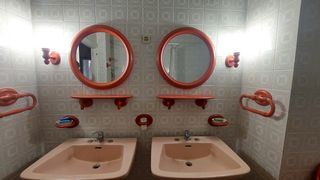 Set di accessori per il bagno in stile vintage anni '70. Un tocco di colore e originalità per il tuo bagno. - 2 specchi rotondi - 2 mensoline sotto specchio - 2 lampade (parte in vetro in parte scheggiata) - 3 portasaponi con parte in ceramica - 1 porta spazzolini - 4 porta asciugamani - 2 appendini - 1 porta rotolo carta igienica