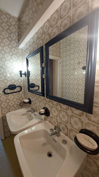 Set di accessori per il bagno in stile vintage, risalenti agli anni '70. Un tocco retrò per il tuo ambiente. - 2 specchi rettangolari - 2 lampade (parte in vetro scheggiata) - 2 portasaponi con parte in ceramica (in parte scheggiata) - 1 porta spazzolini - 2 porta asciugamani - 1 appendini - 1 porta rotolo carta igienica.