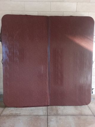 Copertura termica per jacuzzi nei toni del beige e del grigio. Progettata per mantenere la temperatura dell'acqua e proteggerla. Realizzata con materiali resistenti. Include cinghie di fissaggio. Dimensioni 220x220. Buono stato, basta pulirlo ed è pronto.