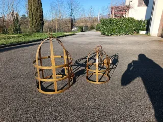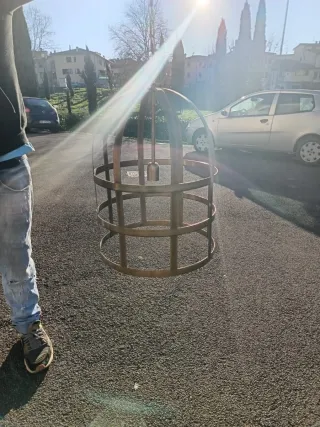 Coppia di lampadari in ottone con catena. - Design a gabbia. - Ideali per decorazioni o illuminazione. - Struttura in metallo.