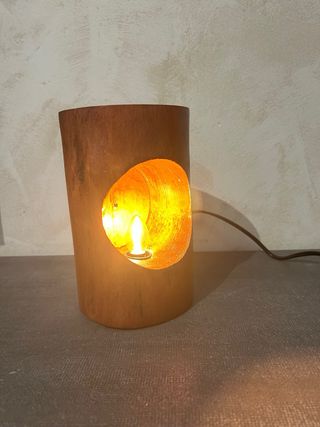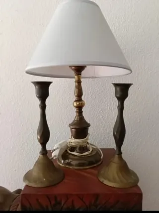 Set decorativo che include una lampada da tavolo e due candelabri. - Lampada con base e base in metallo. - Schermo in carta. - Due candelieri in metallo con design intagliato