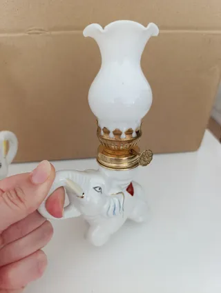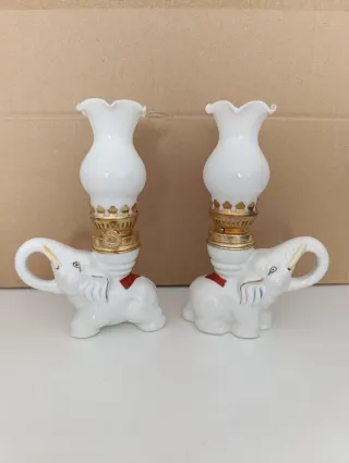Splendida coppia di lampadari decorativi a forma di elefante. Si consiglia l'uso di olio di paraffina. - Design di elefante in ceramica bianca. - Dettaglio di decorazioni in rosso e blu. - Stoppino regolabile per aumentare o diminuire la fiamma. - Finitura superiore in vetro bianco.
